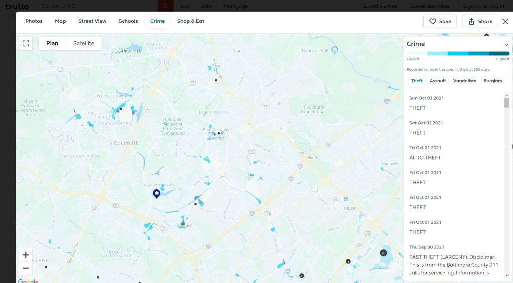 Exemple de recherche sur le site Trulia – on peut voir les crimes, la date, le lieu et de quoi il s’agissait!